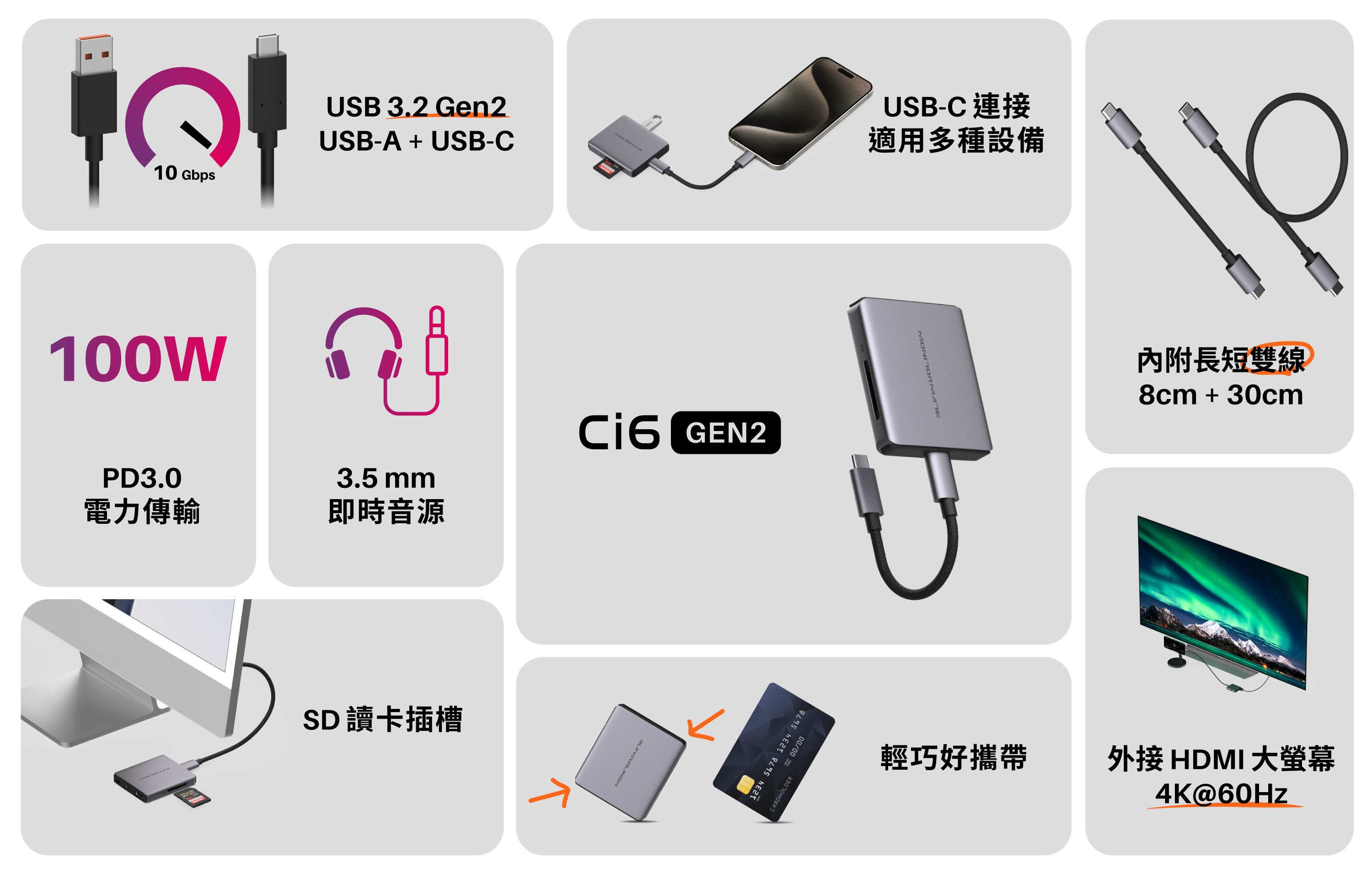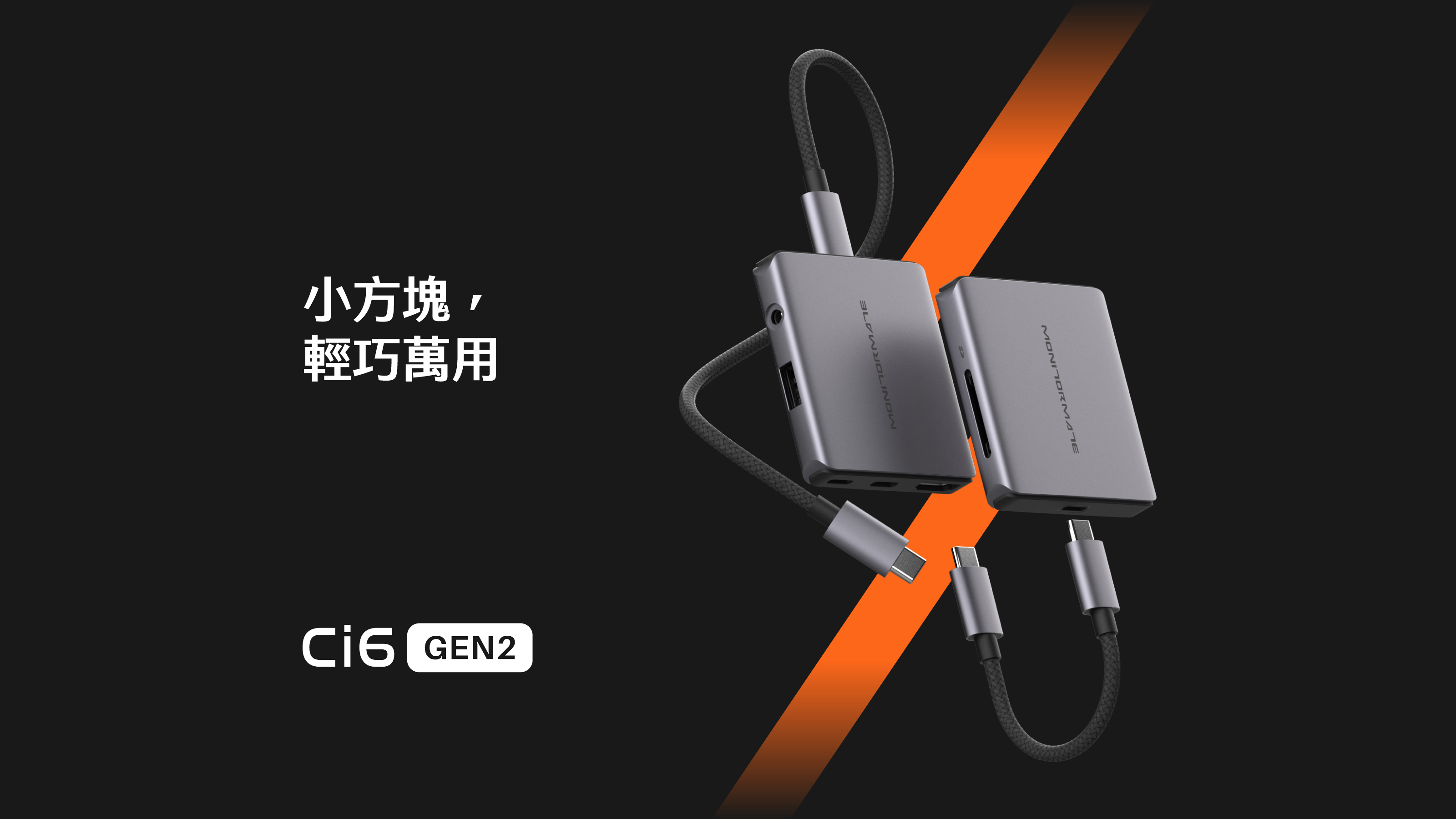 Ci6 採用正方形設計,近似一塊餅乾大小,輕巧好收納。不論是在辦公室、旅行中,甚至是在咖啡店,它都是您隨身攜帶的理想選擇,隨手取出就能輕易地滿足您的連接需求。