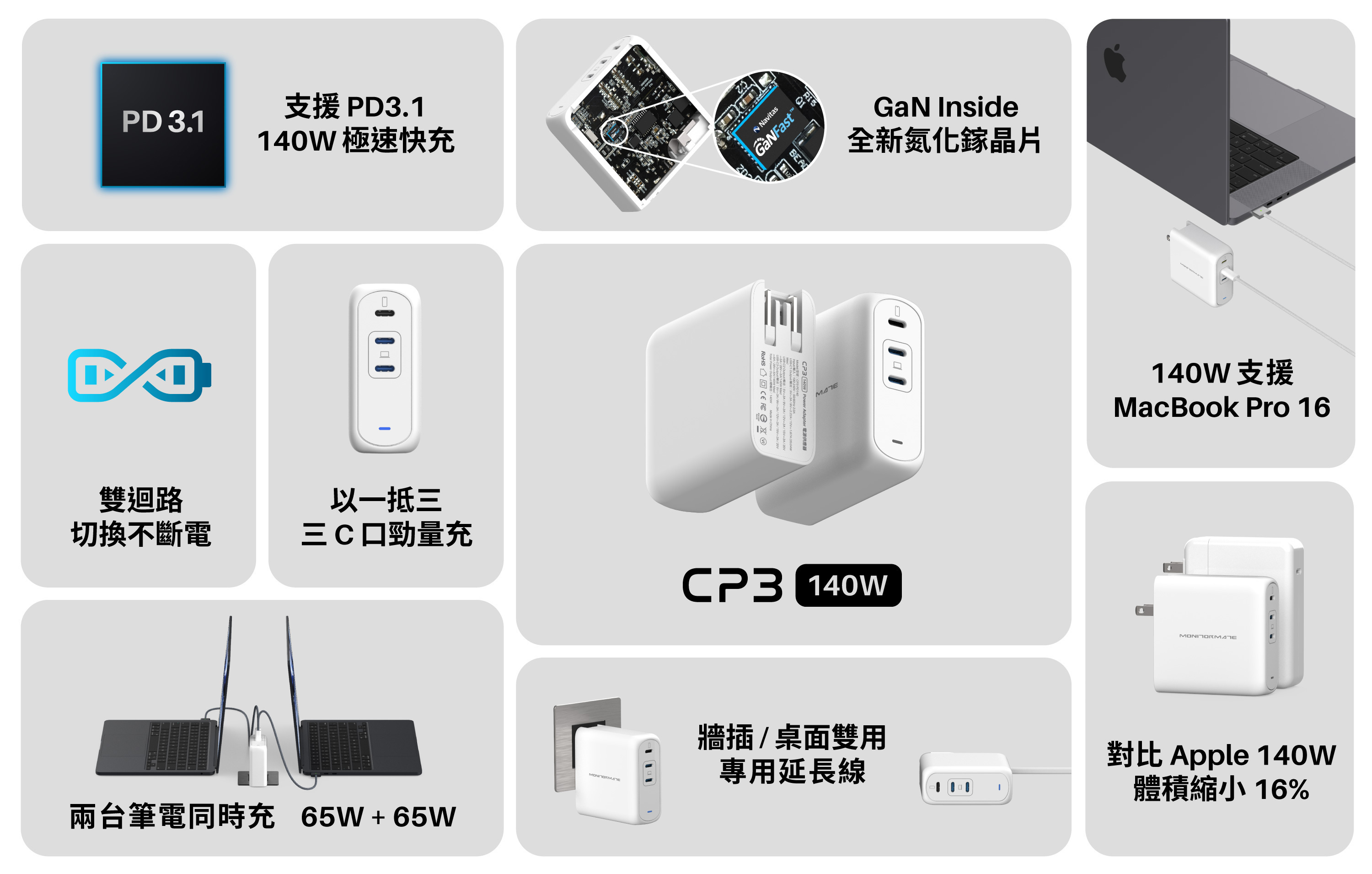 小巧極簡的外型,卻滿載 140W 的強大電力。搭配隱藏式的摺疊插腳設計,不論出國旅行、外出辦公、或是在家使用,既強大又方便攜帶。