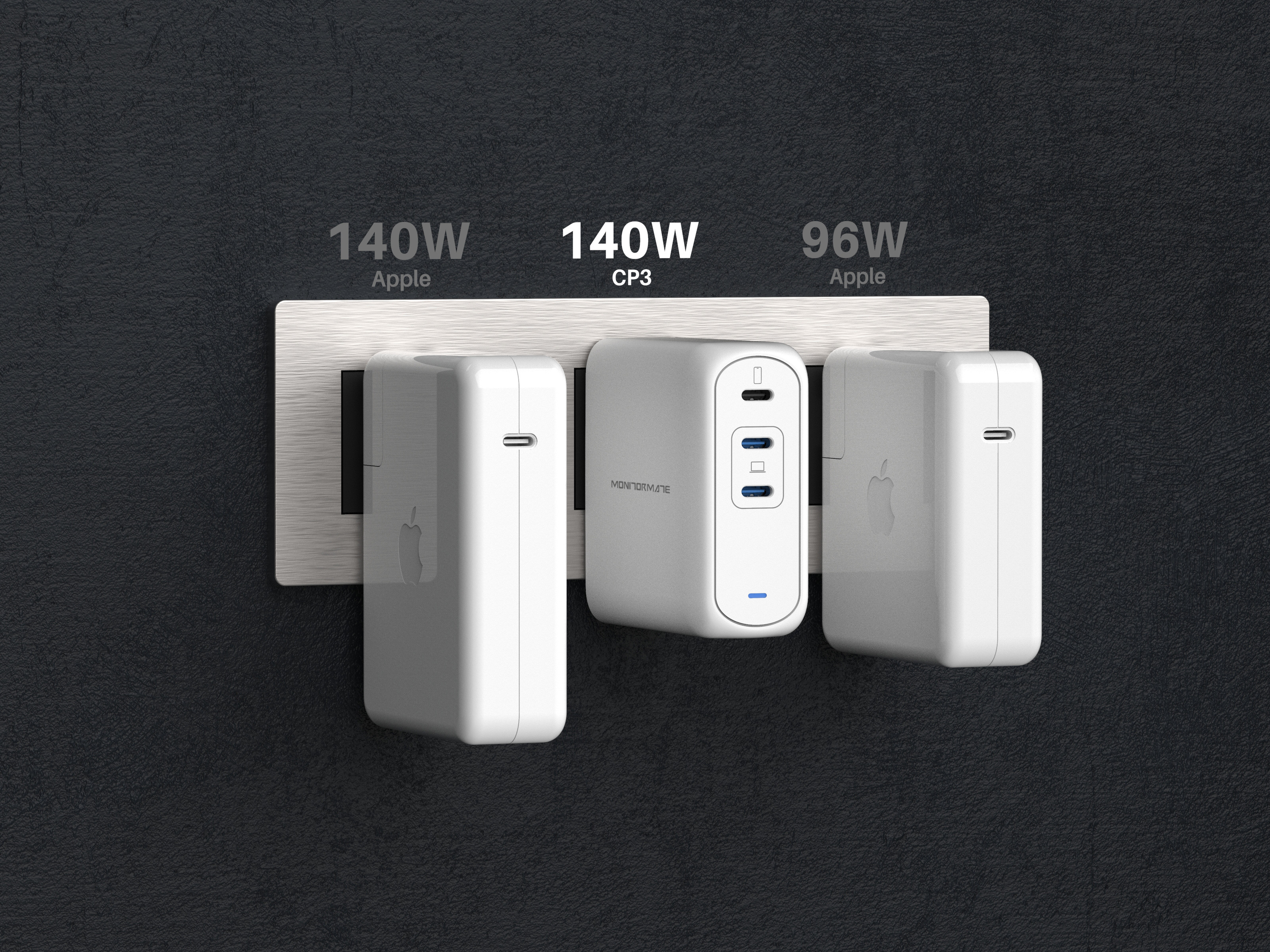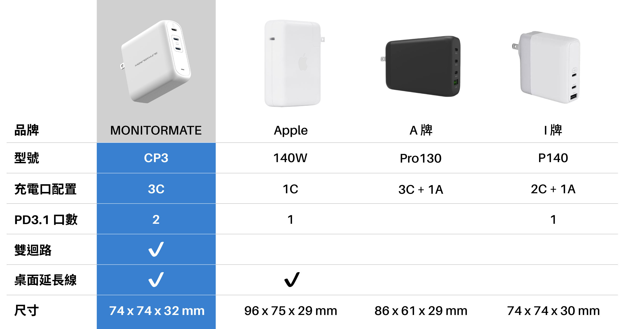 ▲ 與總功率同為 140W 的 Apple 電源轉接器,CP3 在體積上小了 16%