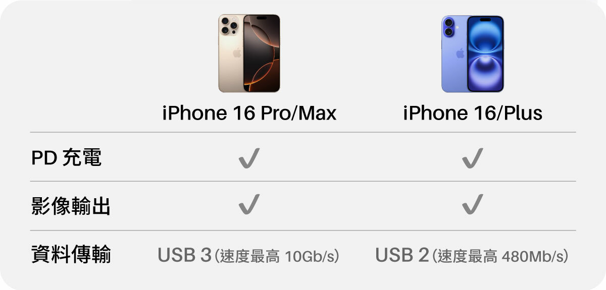 ▲ iPhone 16 Pro 與 iPhone 16 的 USB-C 擴充規格比較