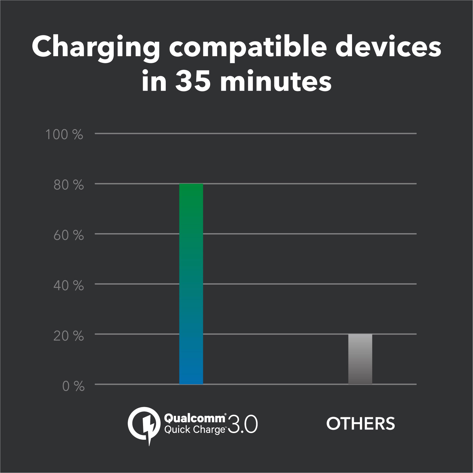 Quick Charge 3.0 port charges up to 4x faster than conventional charging ports and to 80% battery charge in 35 minutes when charging compatible devices. Up to 38% more efficient than Quick Charge 2.0. Backward compatible with Quick Charge 2.0/1.0 and normal USB powered devices.