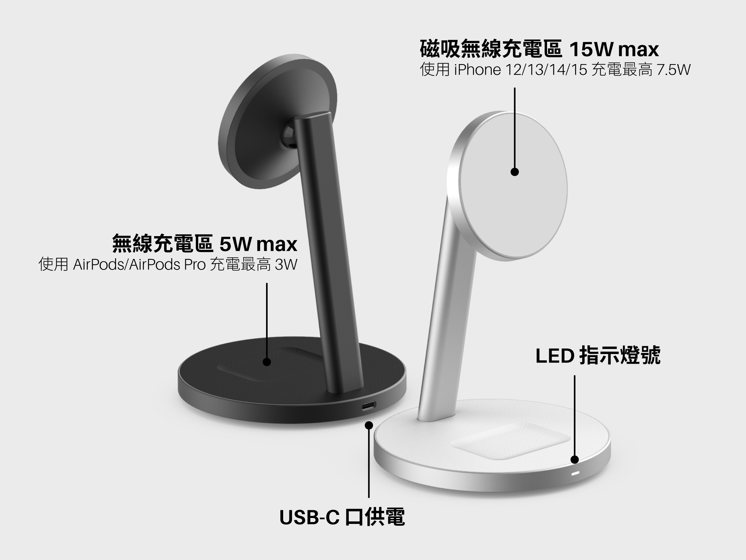 *上方充電模組對應 iPhone 12/13/14/15 可供 7.5W **下方充電模組對應 AirPods 可供 3W