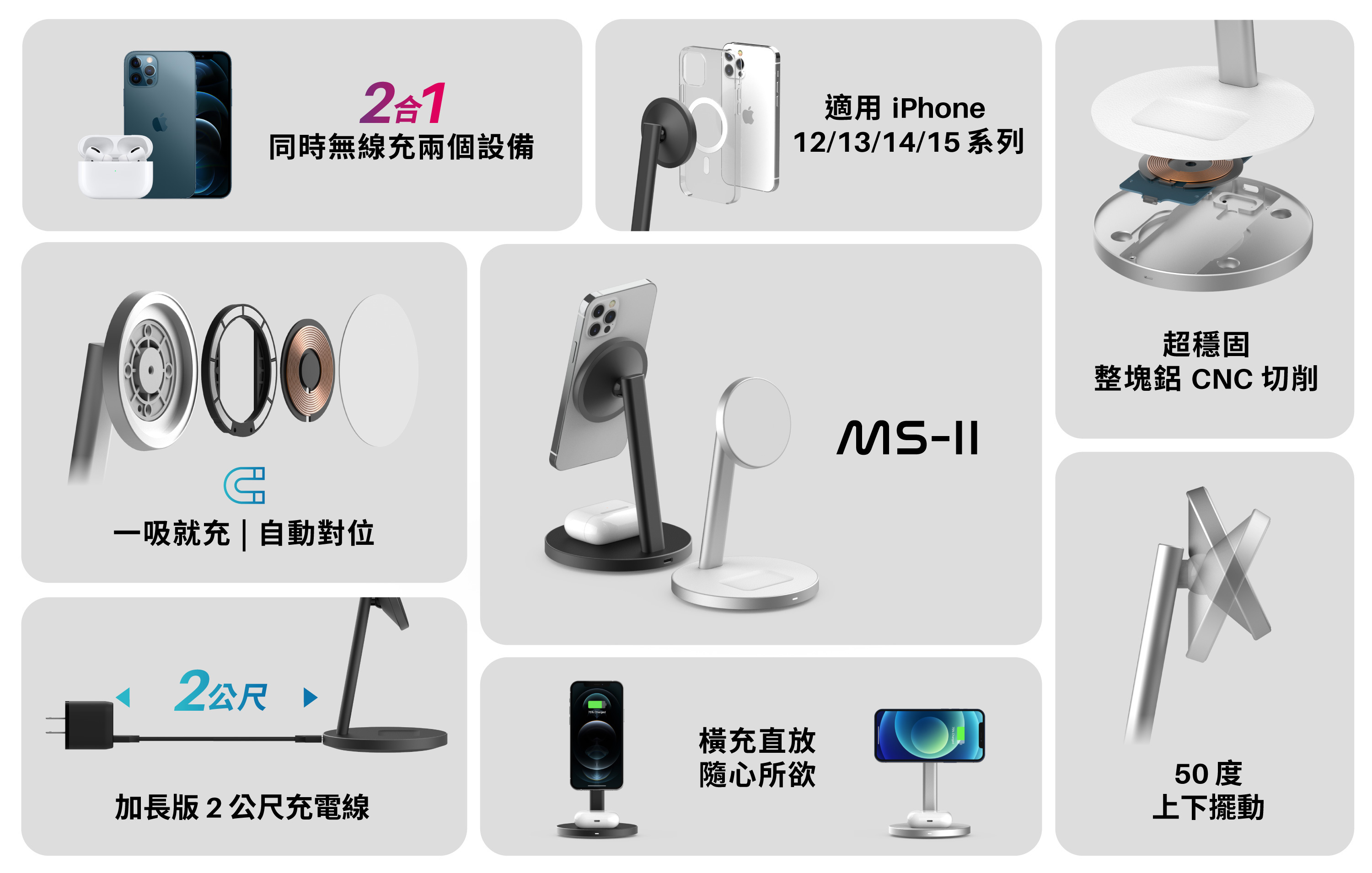 多達八顆強力磁鐵排列組成,完美相容於 MagSafe,支援 iPhone 12/13/14/15 磁吸無線充電。 手機直放,平擺都好用。放上就充,釋放雙手,工作效率再加倍!
