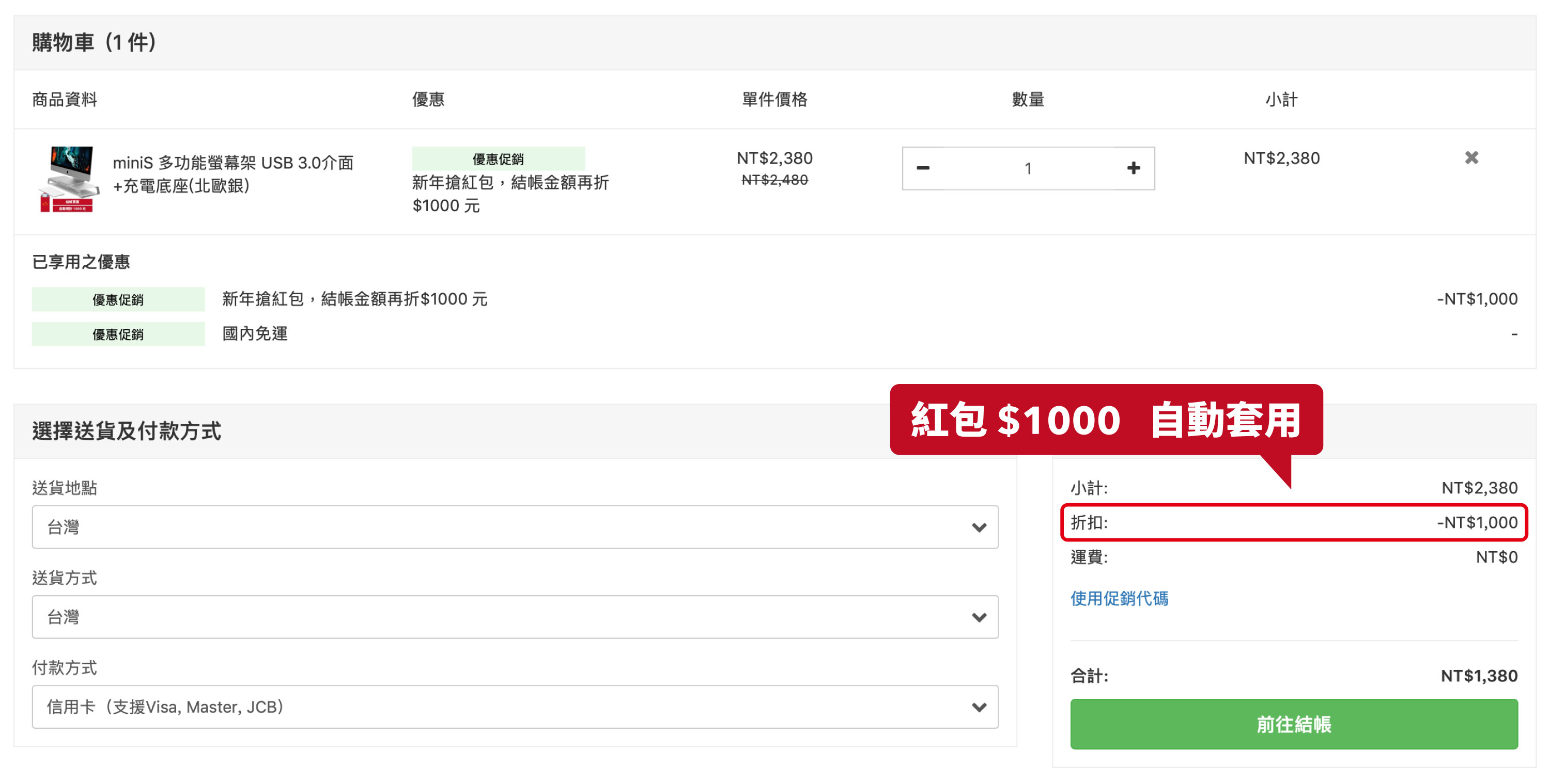 送 1000 元紅包現折券,活動期間:1/9 - 1/15 1/20 23:59(好評延長)