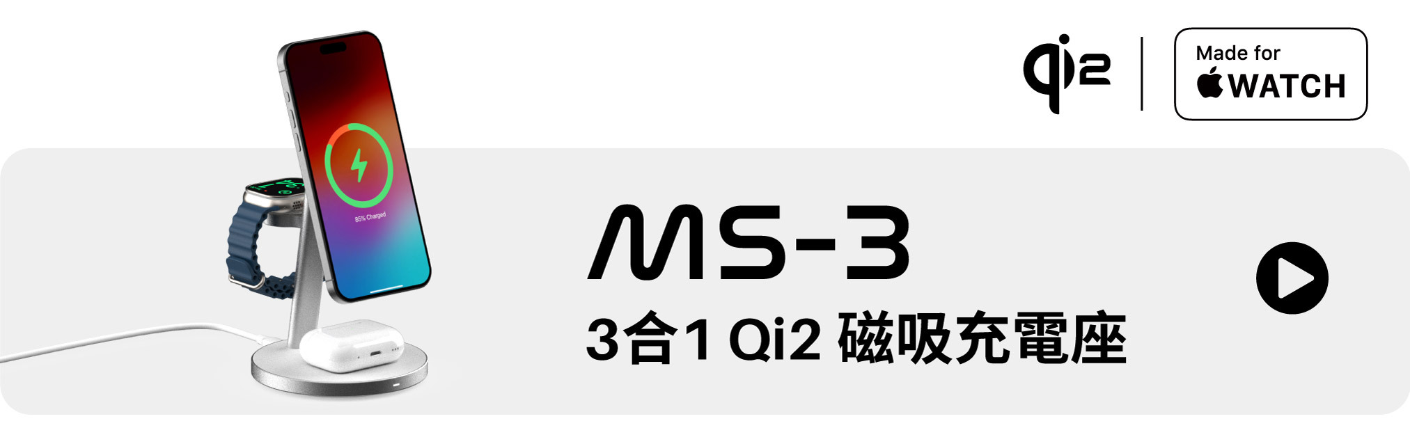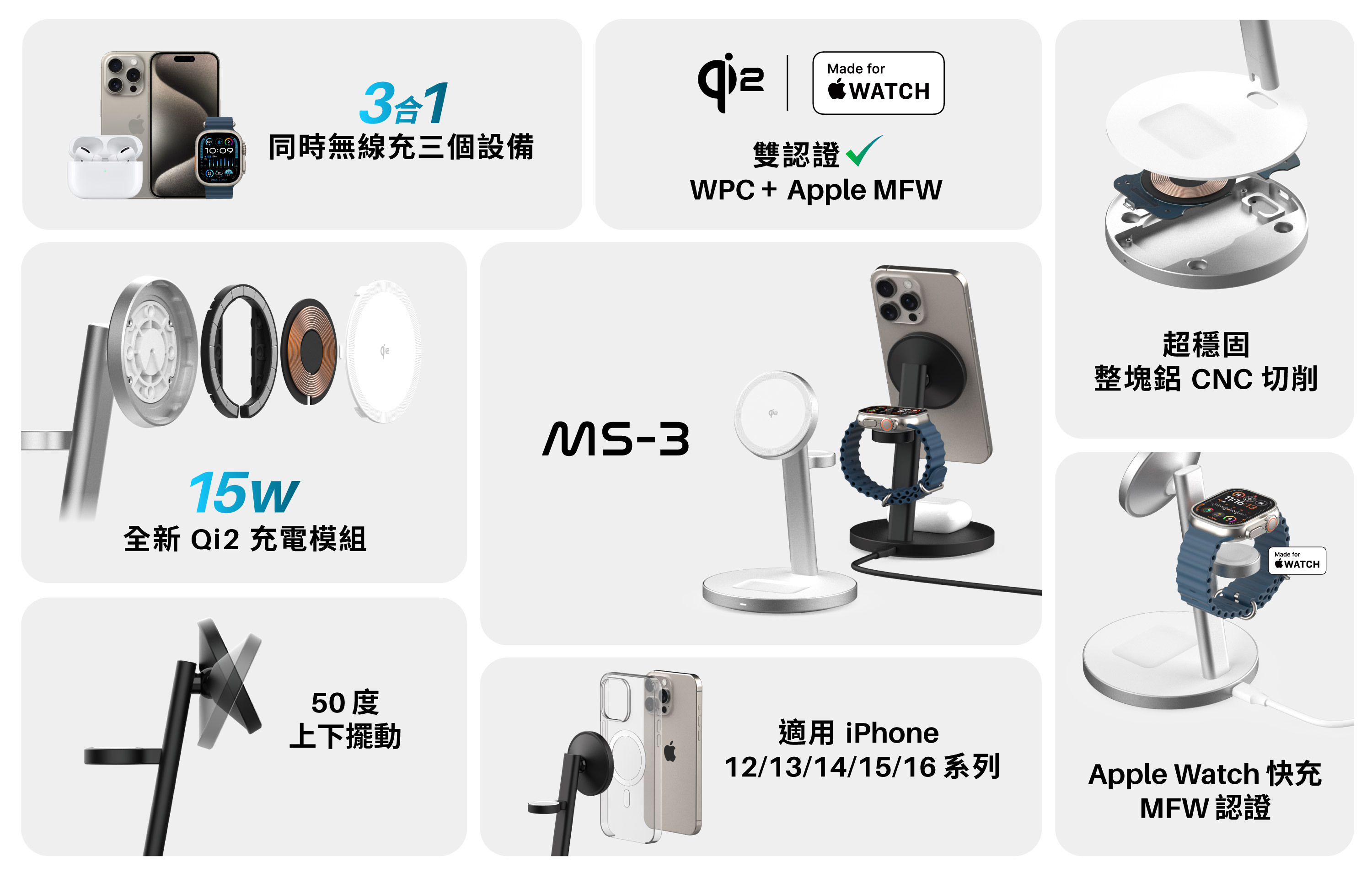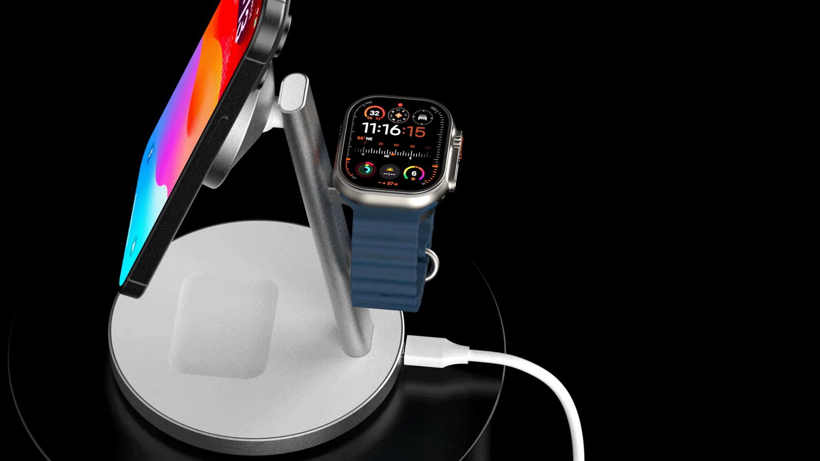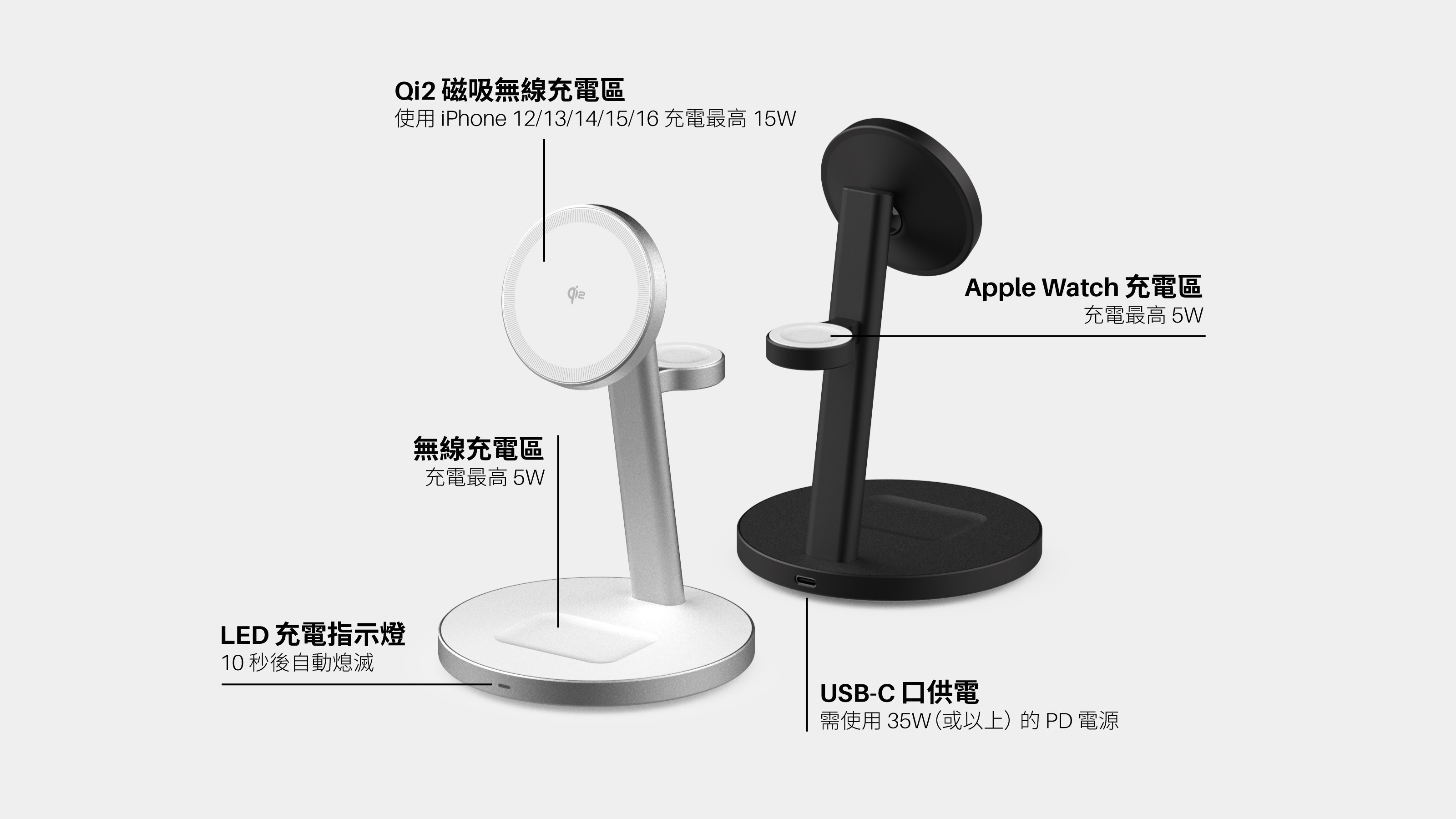 上下都可充,一次可充兩支手機,或是同時幫你的 iPhone 與 AirPods 充電,後方再搭配一組專為蘋果手錶設計的快充模組,可以幫您的 Apple Watch 快速充電。