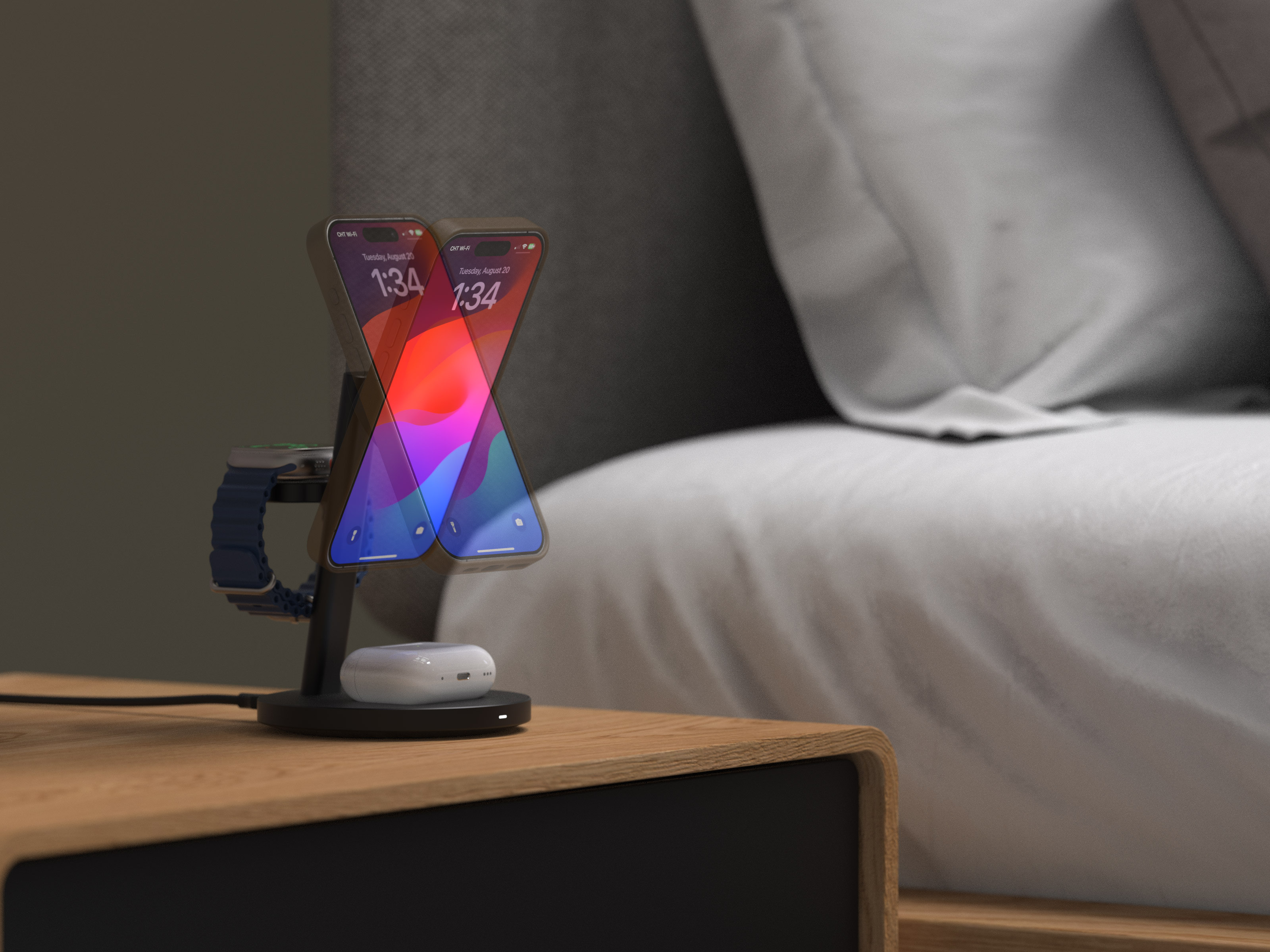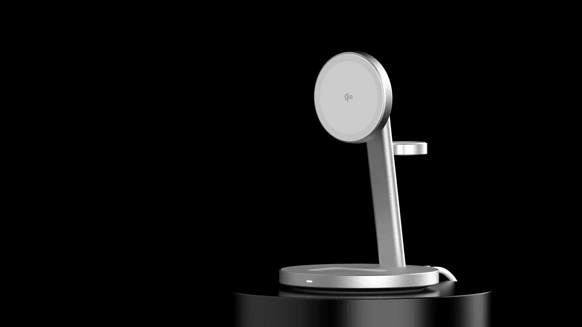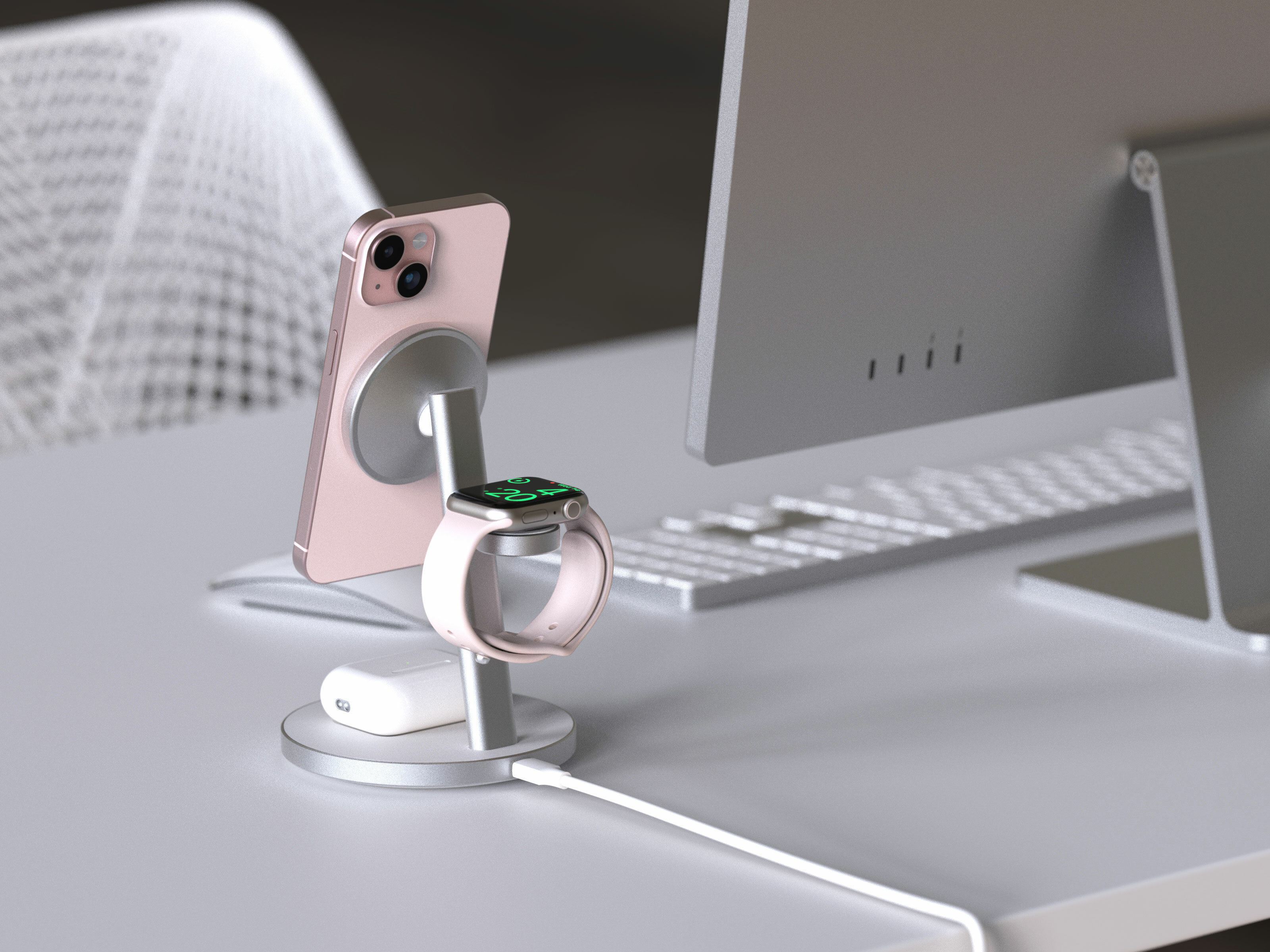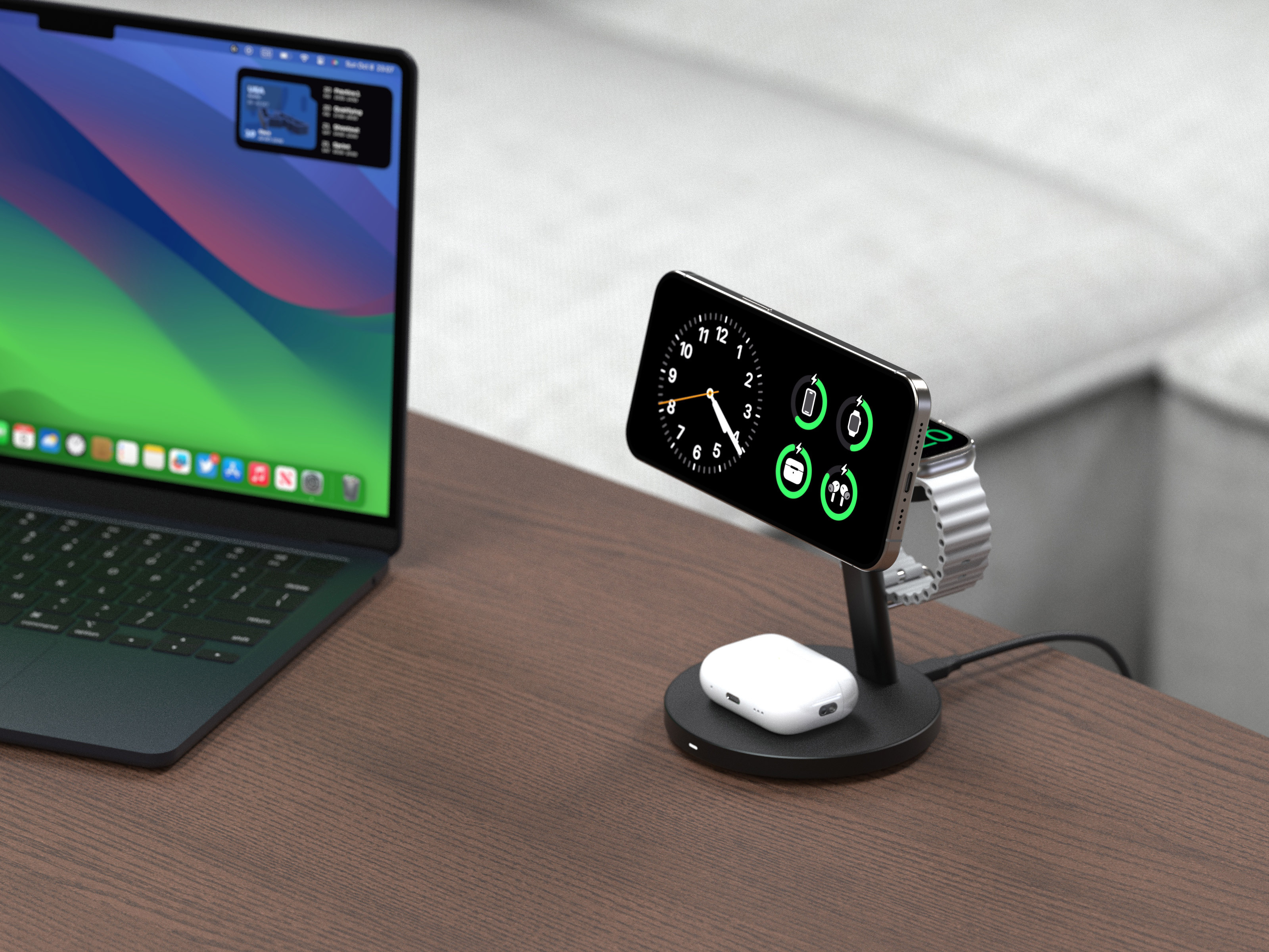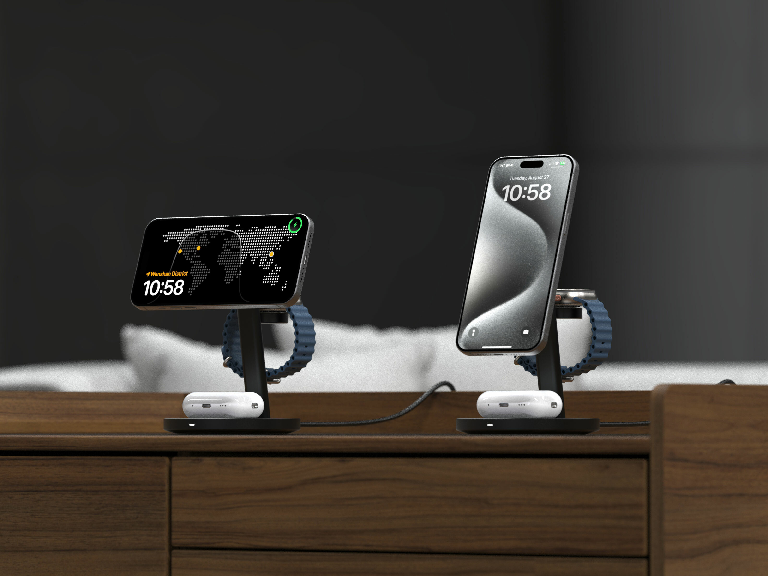 上下都可充,一次可充兩支手機,或是同時幫你的 iPhone 與 AirPods 充電,後方再搭配一組專為蘋果手錶設計的快充模組,可以幫您的 Apple Watch 快速充電。