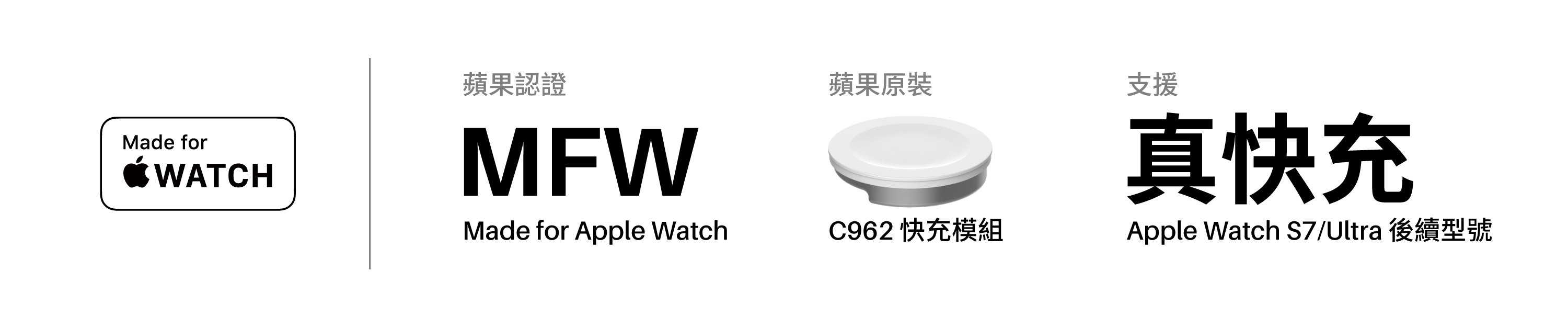 手錶充電部分,選用蘋果原裝 C962 快充模組,通過 Apple MFW 認證,確保與所有 Apple Watch 型號完美相容,包括最新的 Apple Watch Ultra2。充電速度優越*,可以在 30 分鐘內將 Apple Watch 從 0% 充到 49% 的電量,並具備過電流、過電壓、短路和過溫保護功能。