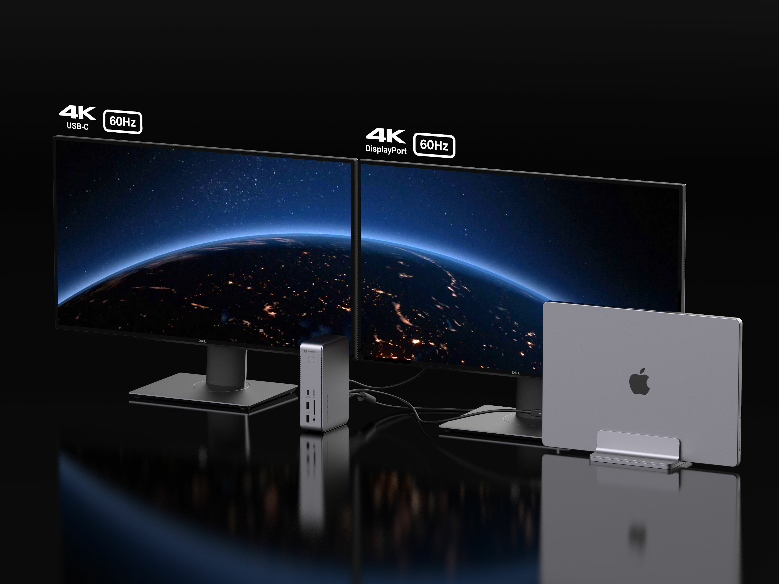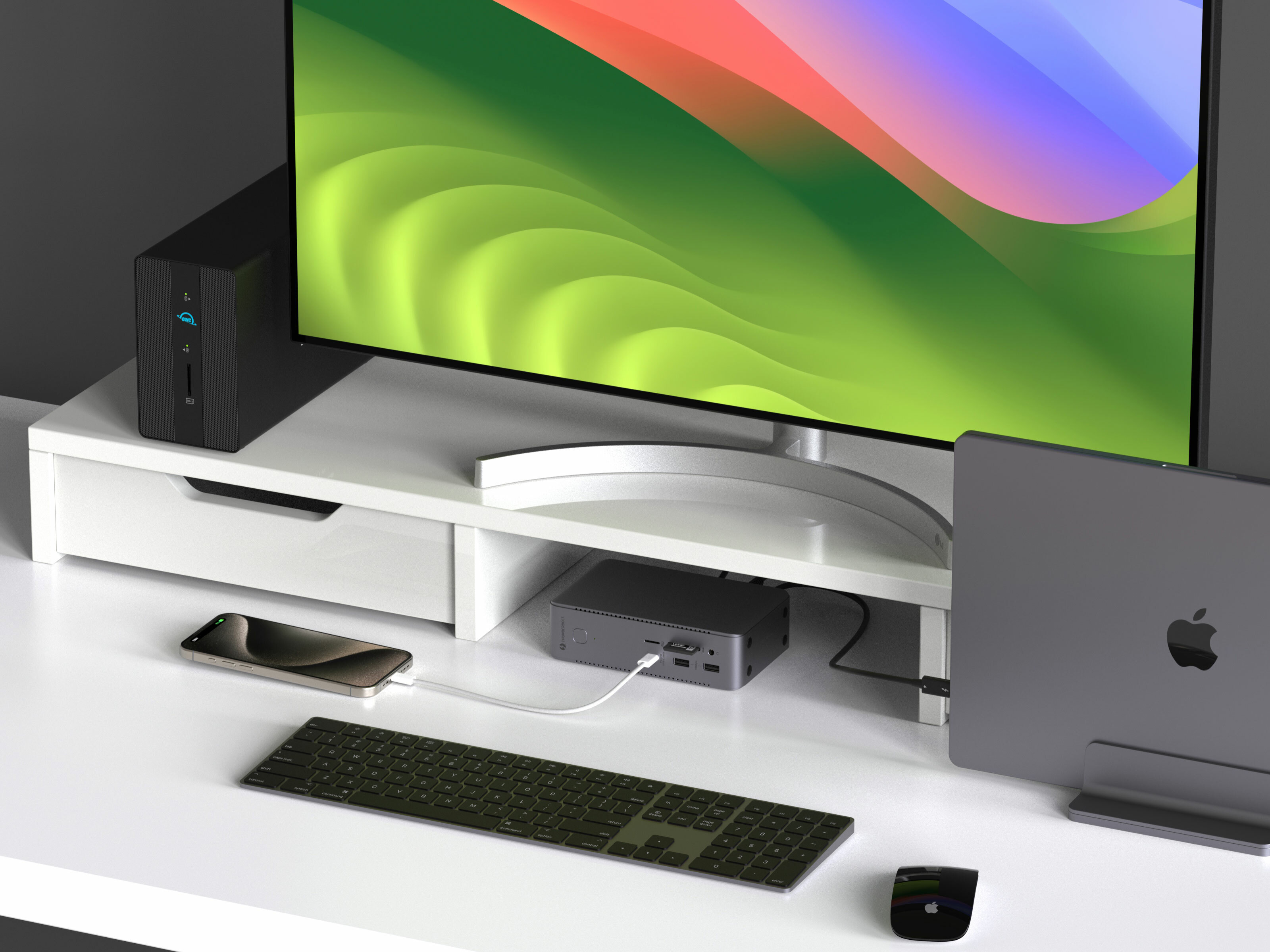兩組腳墊規劃,穩定好放。不論站立,還是平躺,都可以輕鬆融入你的桌面佈局。一條 Thunderbolt 線連接到你的筆電,馬上擁有專業級工作站,日常工作效率飆升!
