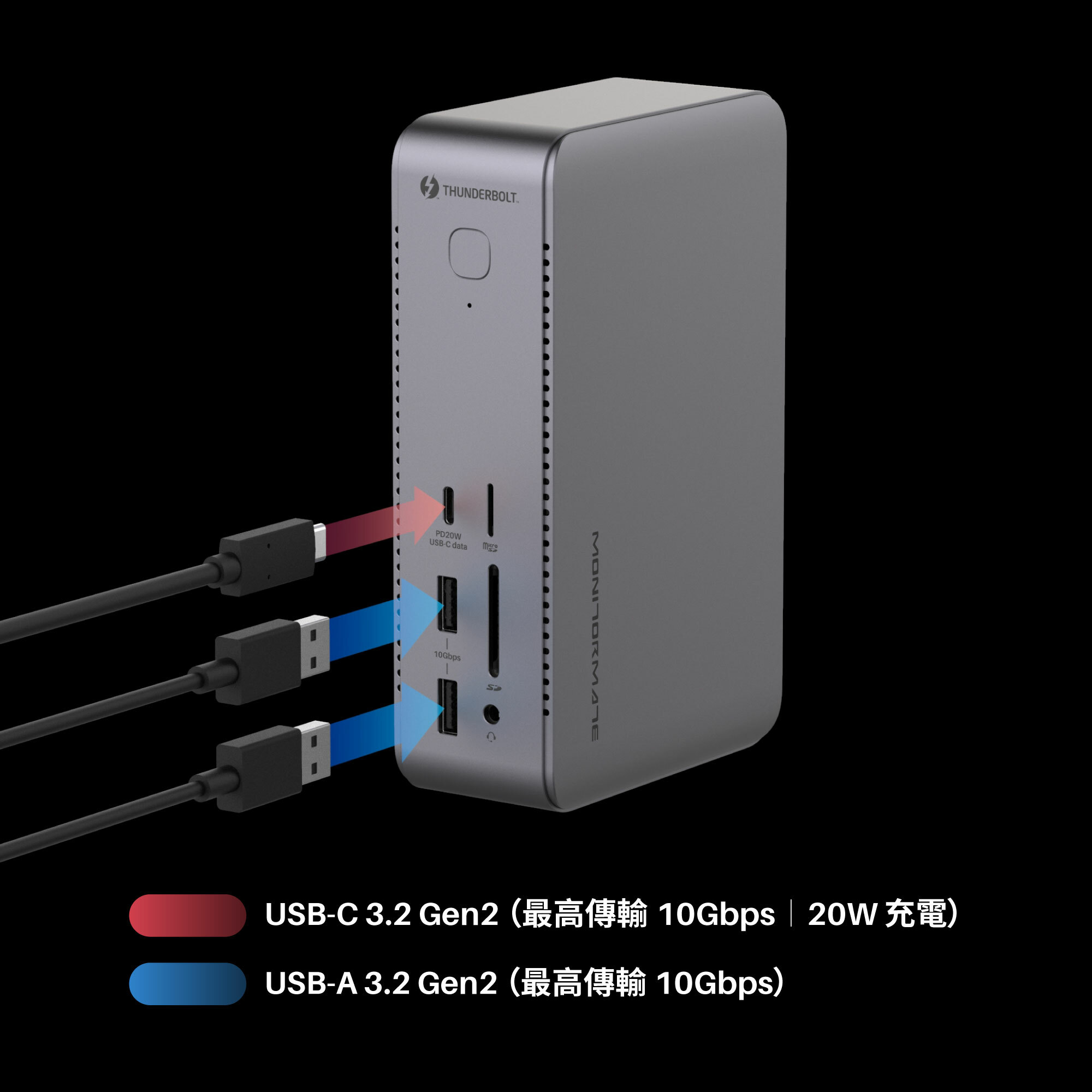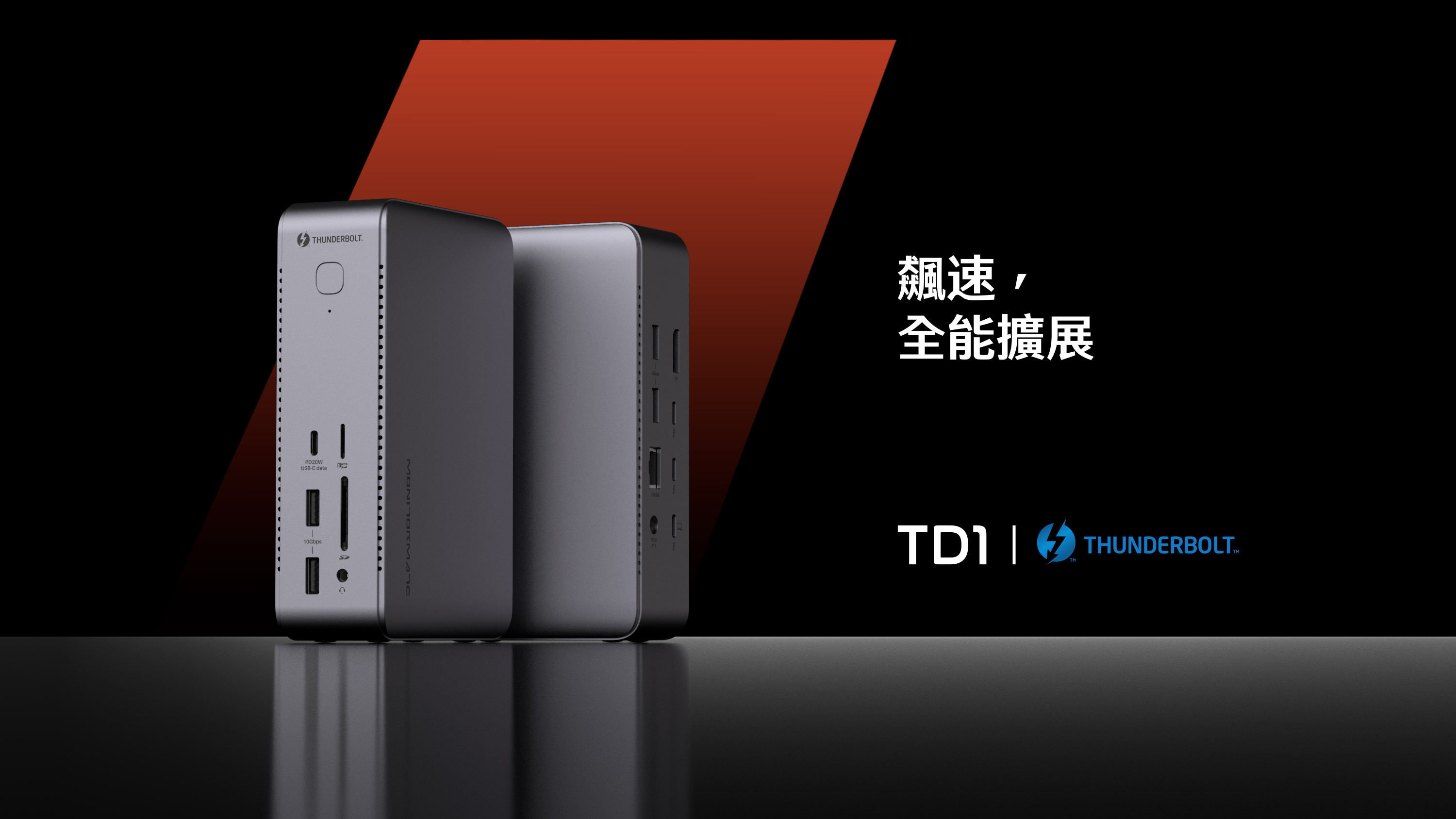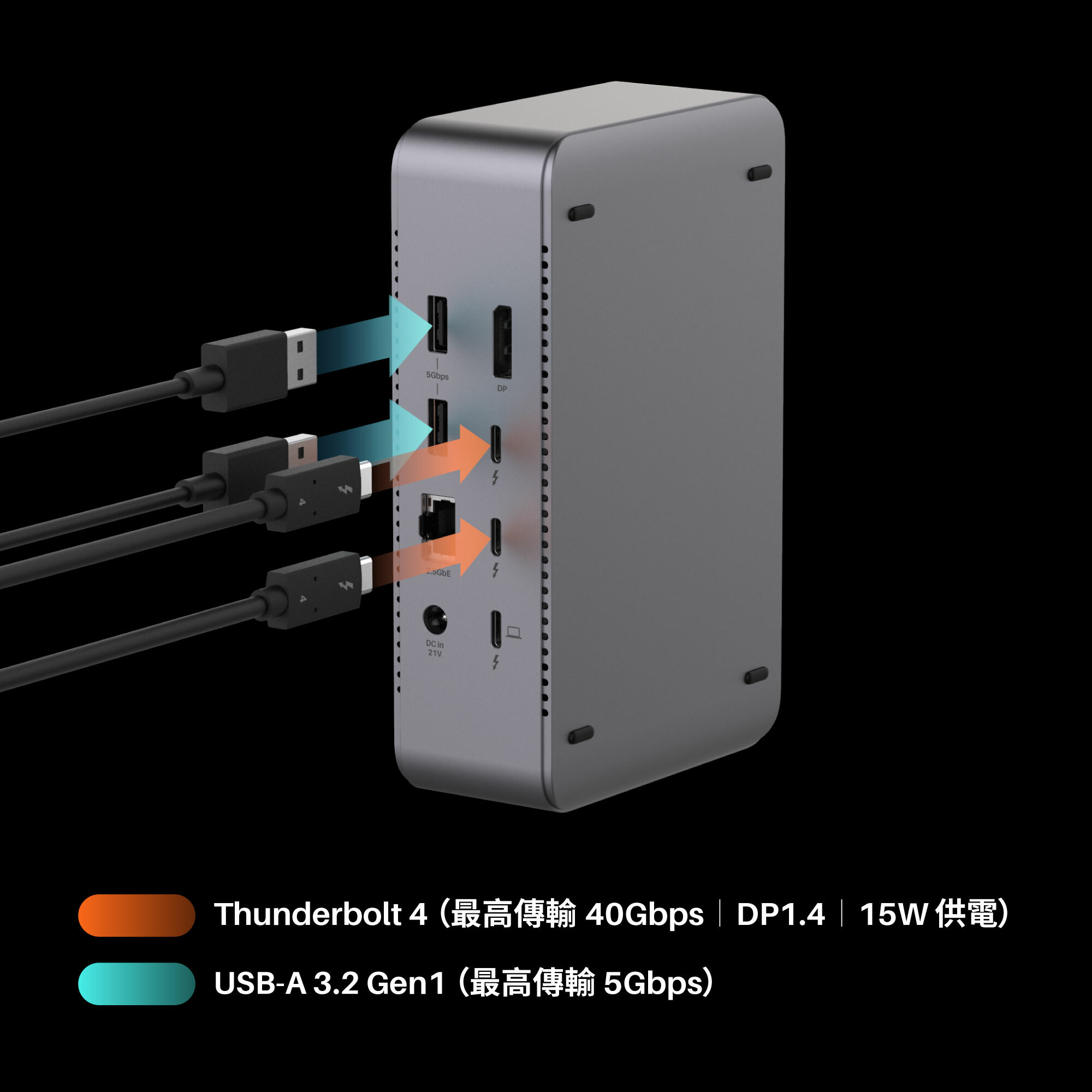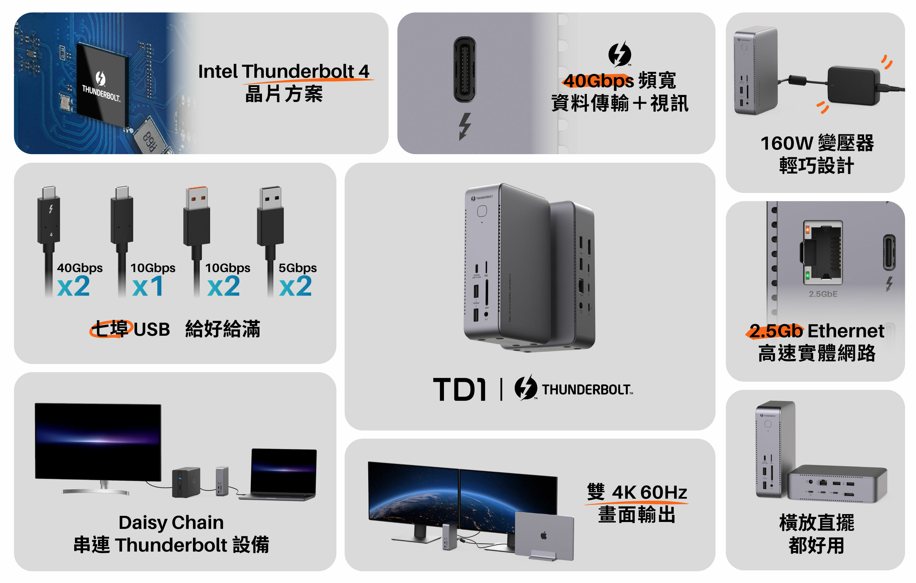 兩個 USB-C ThunderBolt 4(40Gbps,DP1.4,15W 供電),一個USB-C 3.2(10Gbps,20W 快充),以及四個 USB-A(10Gbps x2 + 5Gbps x2)資料口 ,總共七個 USB 埠,從資料傳輸,快充供電,到螢幕輸出,TD1 具備您所有的 USB 擴充需求。