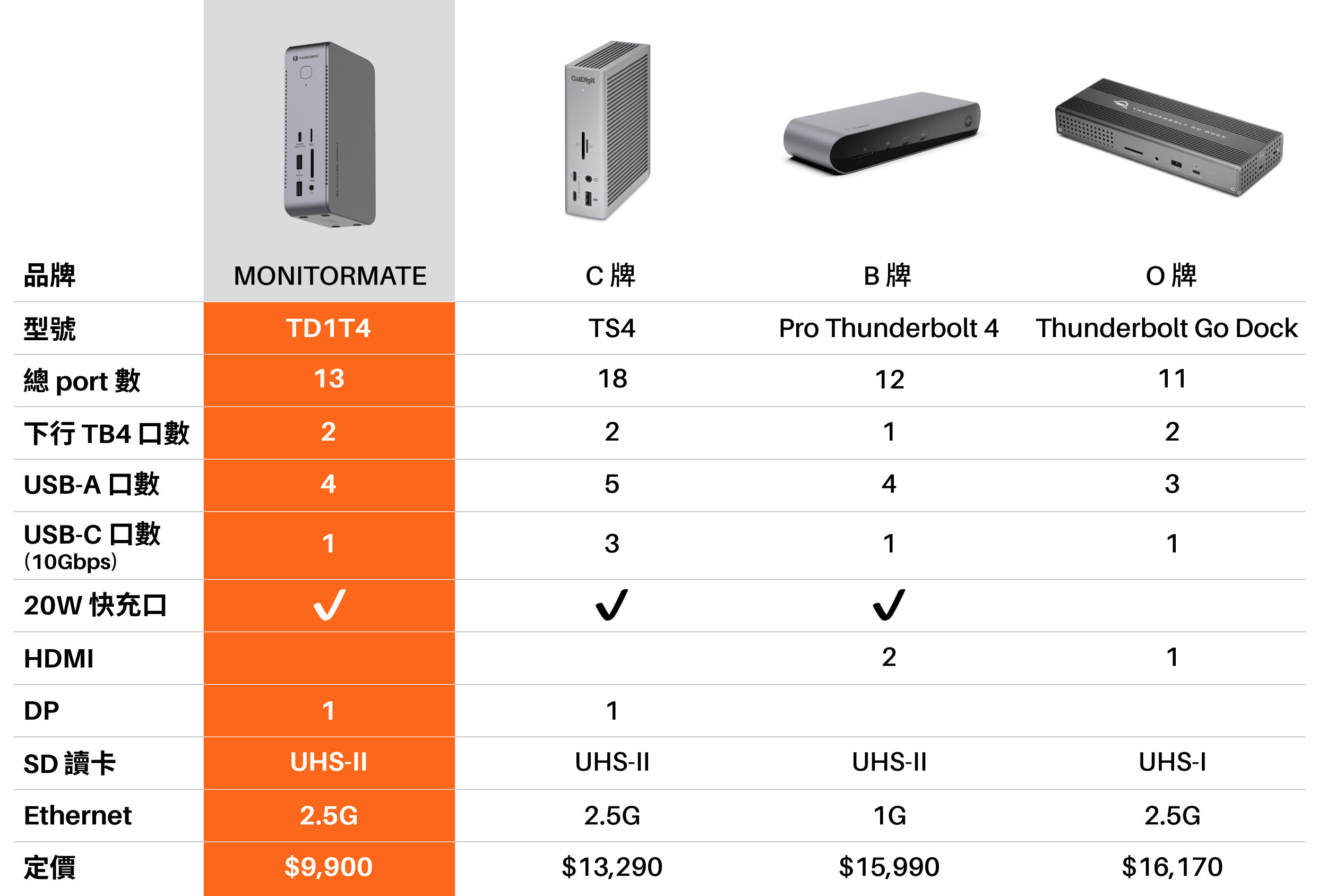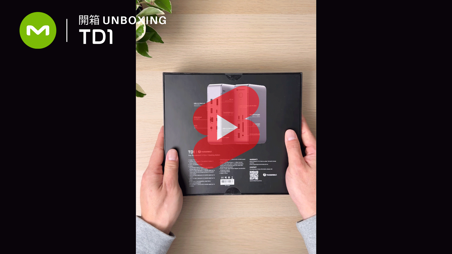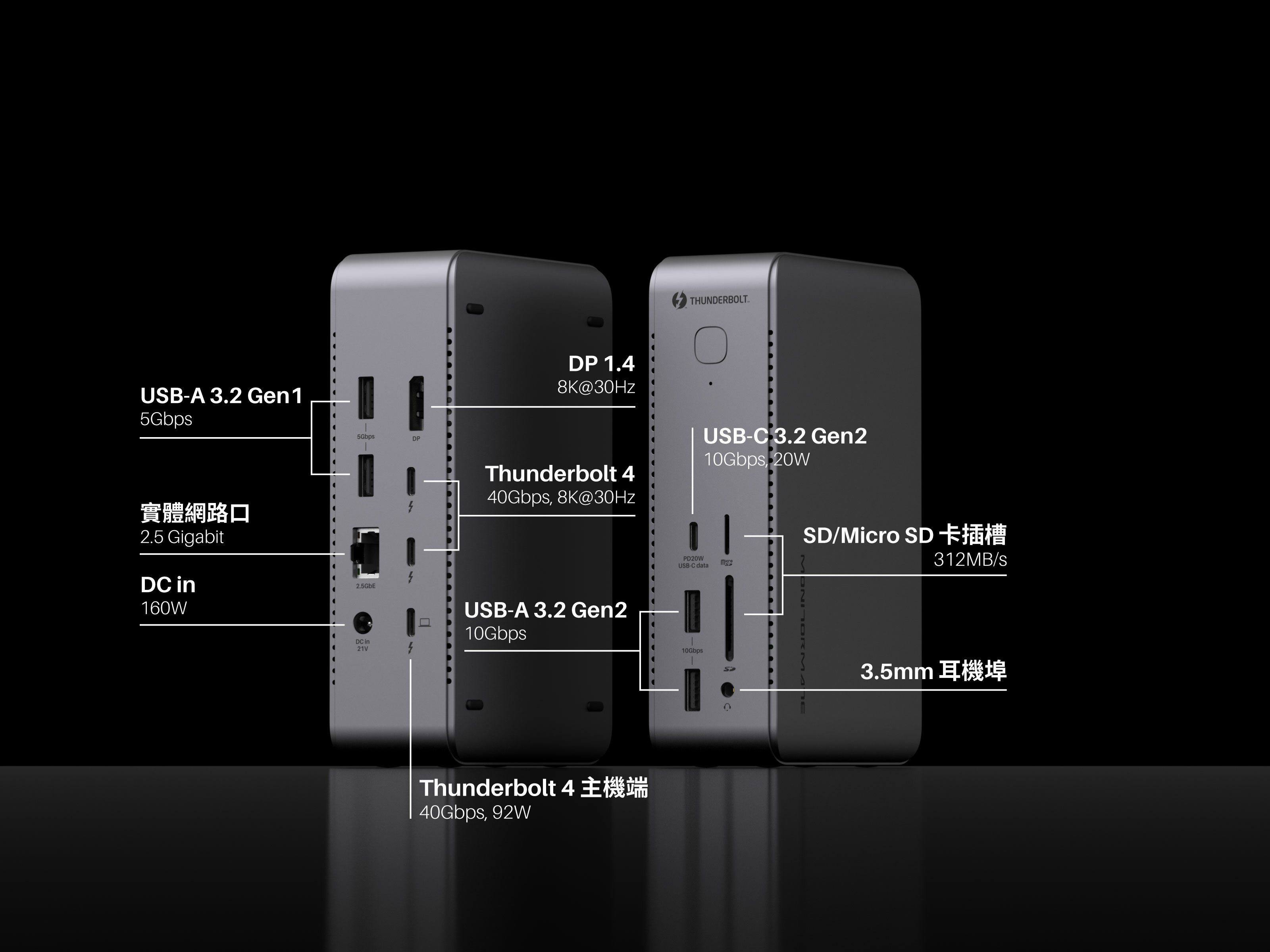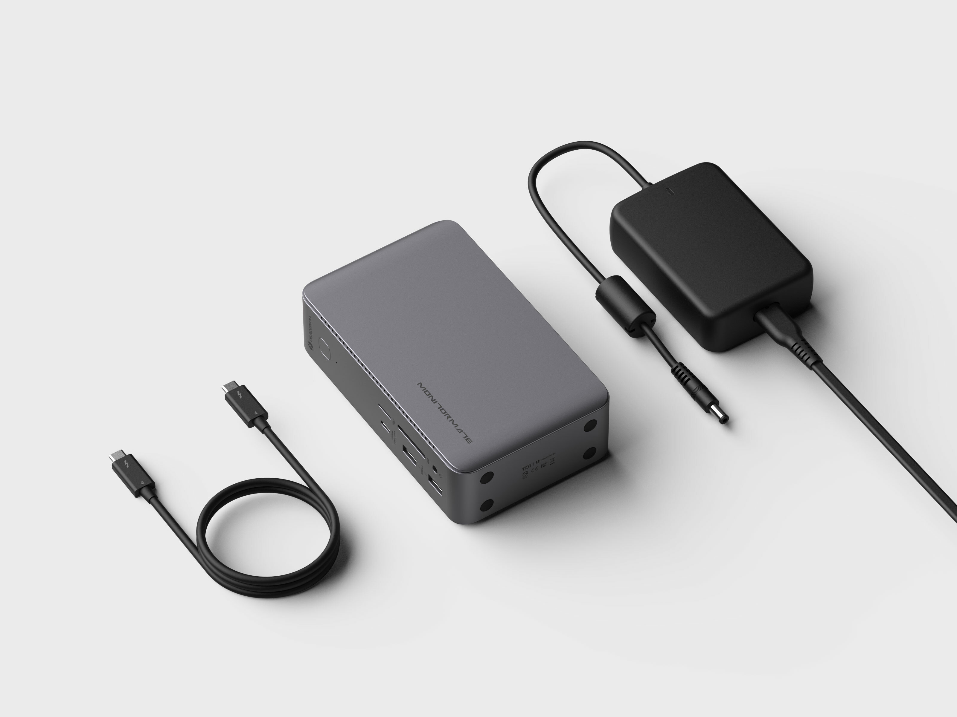 兩個 USB-C ThunderBolt 4(40Gbps,DP1.4,15W 供電),一個USB-C 3.2(10Gbps,20W 快充),以及四個 USB-A(10Gbps x2 + 5Gbps x2)資料口 ,總共七個 USB 埠,從資料傳輸,快充供電,到螢幕輸出,TD1 具備您所有的 USB 擴充需求。