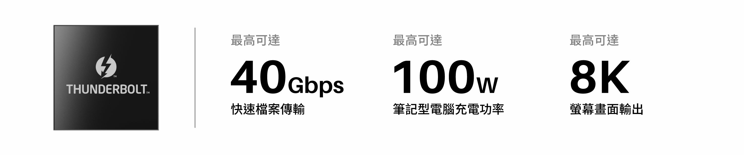 TD1 採用 Intel JHL8440 原裝 Thunderbolt 4 晶片方案,擁有一個上行和兩個下行的 Thunderbolt 4 連接埠,能以最高 40Gbps 的速度傳輸數據並支援高達 8K 的螢幕畫面輸出,一個埠就能滿足所有的傳輸要求。