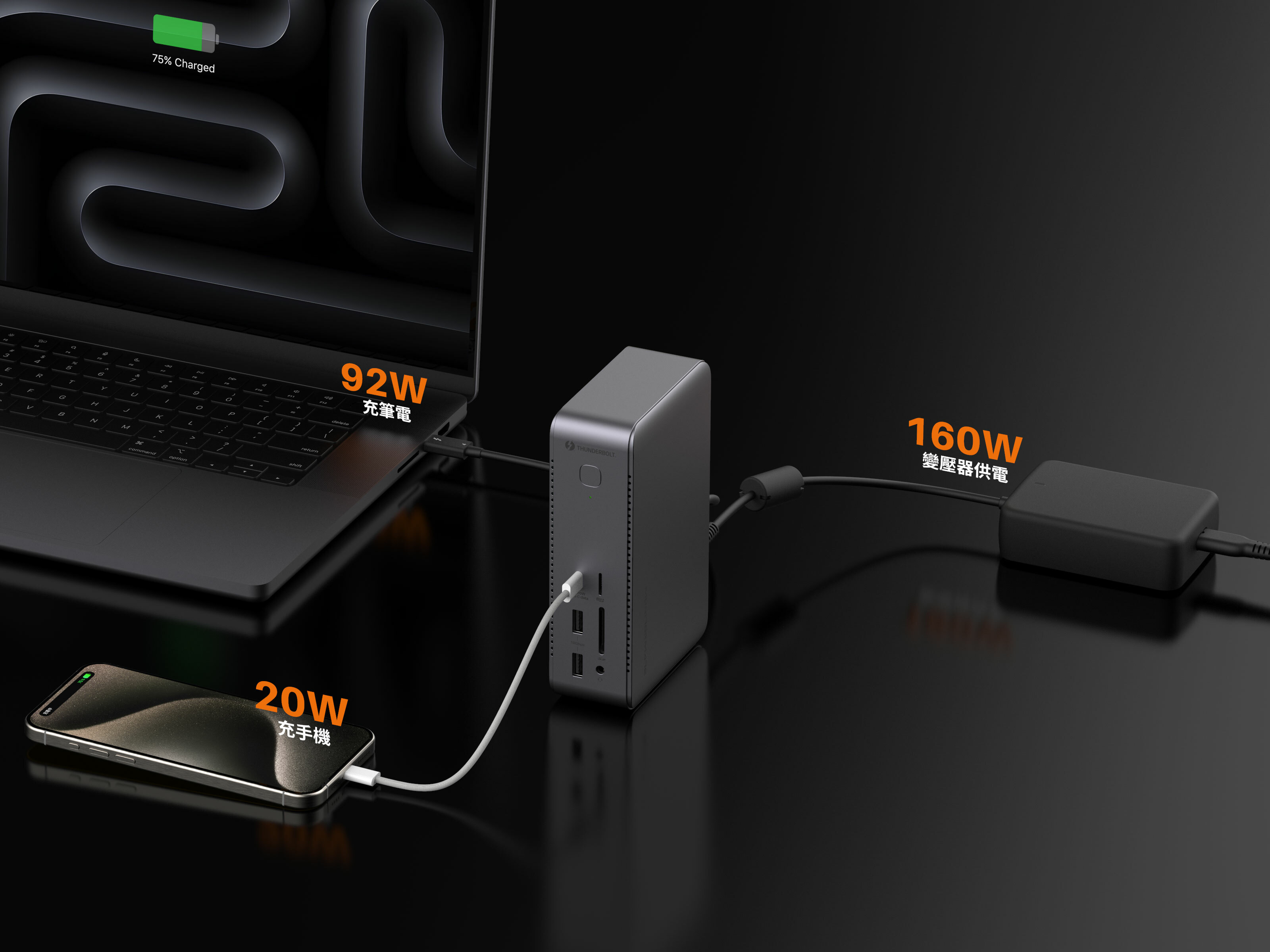 包裝內的變壓器採用 GaN 技術,比起傳統變壓器體積大福縮小,輕巧不佔空間。不單單滿足 TD1 Thunderbolt 裝置的電力需求,還可幫您的筆記型電腦提供高達 92W 的充電。