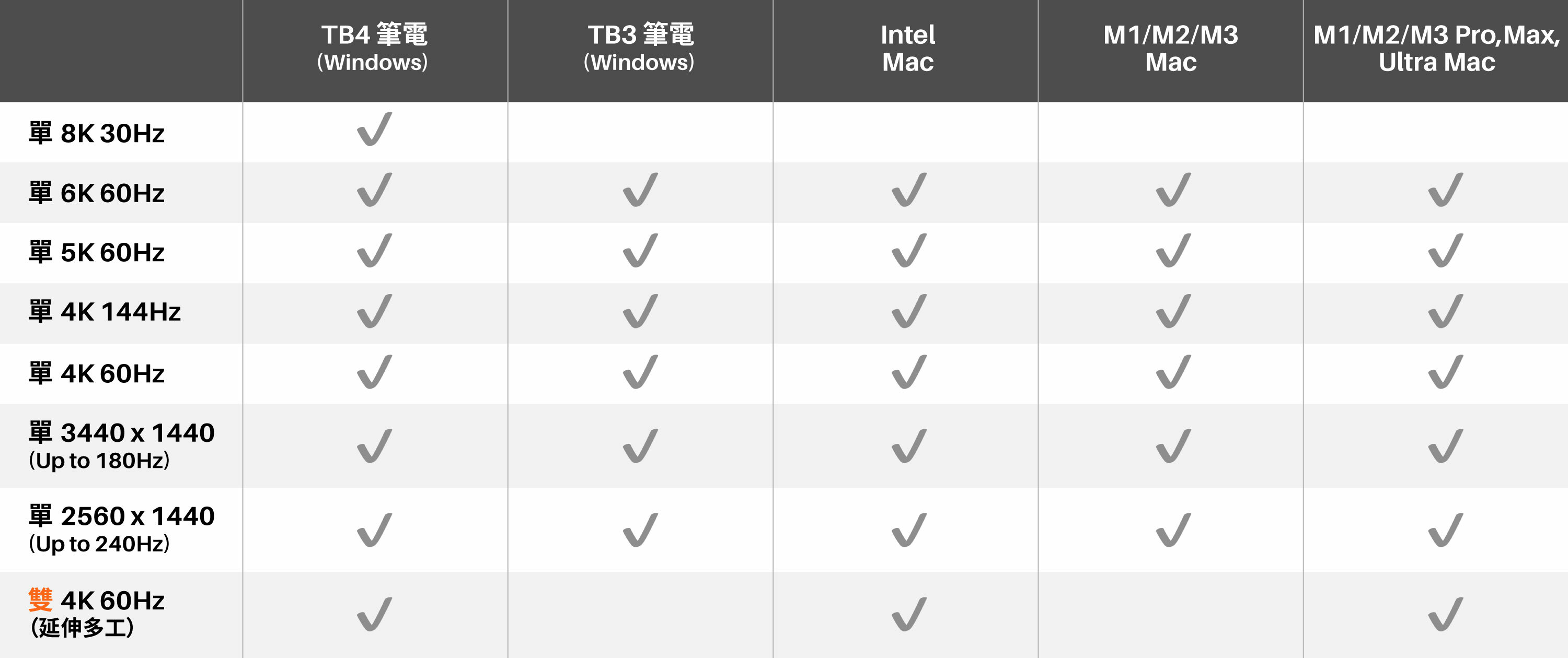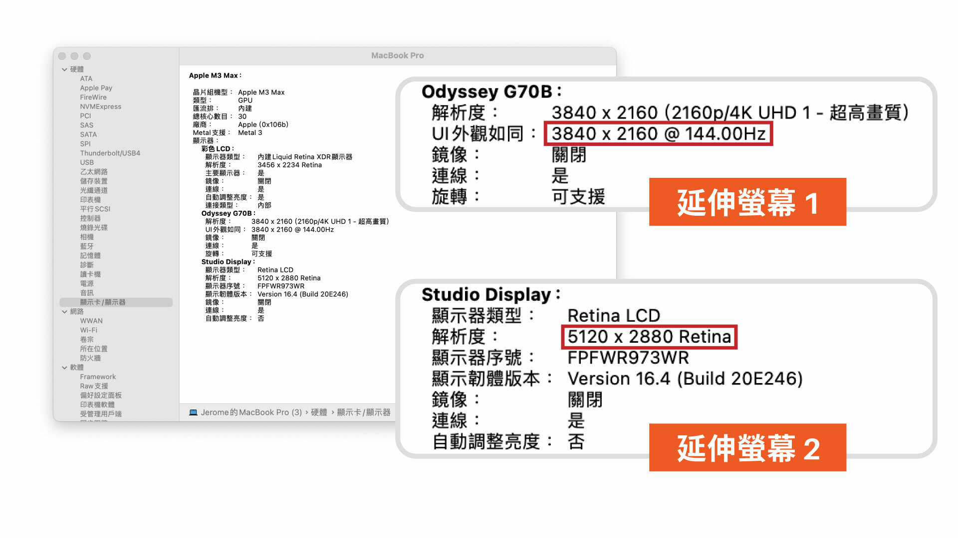 雙 4K @ 60Hz 測試設備:MacBook Pro (16 吋, M3 Max, 2023) / TD1 Dock / Samsung Odyssey 4K Display (DP) / Apple Studio Display 5K (USB-C)