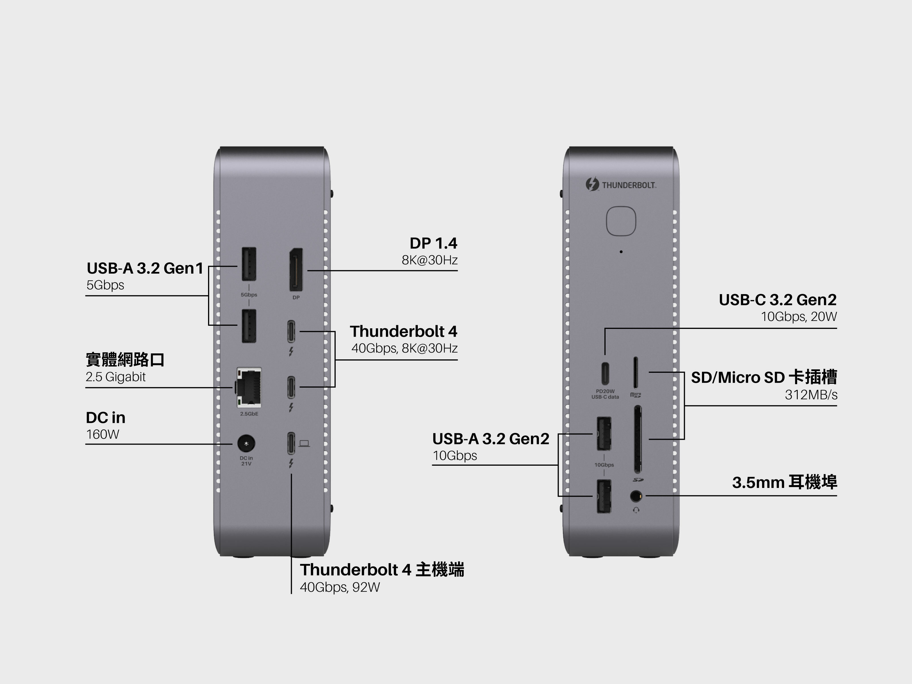 TD1 配備了 3 個 Thunderbolt 4 連接埠,扣除一個連接到筆電並同時用 92W PD 充電的上行口之外,還有 2 個 Thunderbolt 4 下行連接埠,具備當前 USB-C 介面下最強大的傳輸規格,不論是傳輸 (40Gbps),影像 (8K@30),還是 PD 供電 (15W) ,Thunderbolt 4 都面面俱到。