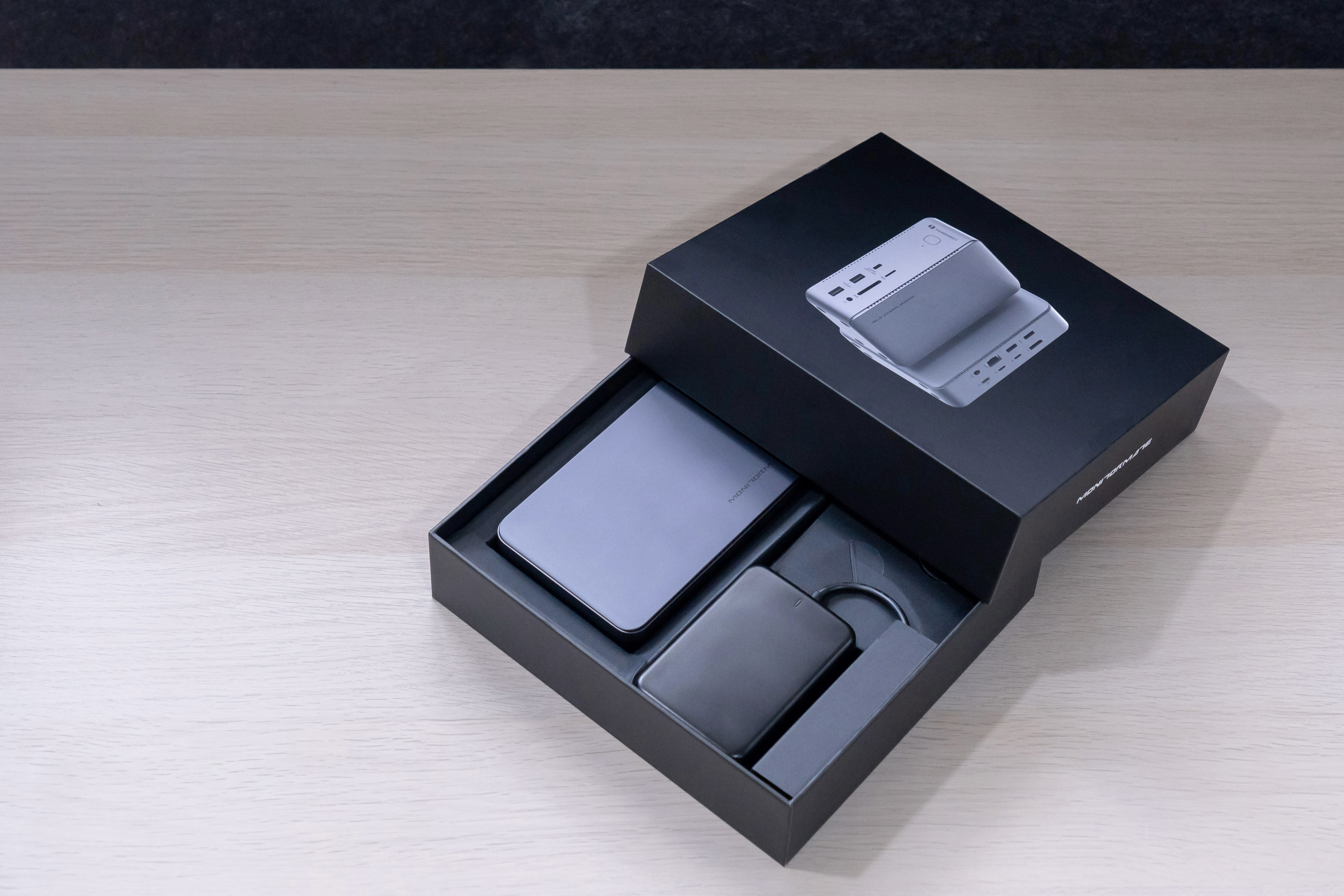 打開包裝紙盒後,盒內採用讓 TD1 Dock 機身、線材獨立分層設計,讓設備都能很好的被保護。機身的外殼由耐用、散熱性佳的鋁製成,兩側則採用鰭片式鋁殼。幫助整體更有效的排除熱空氣。