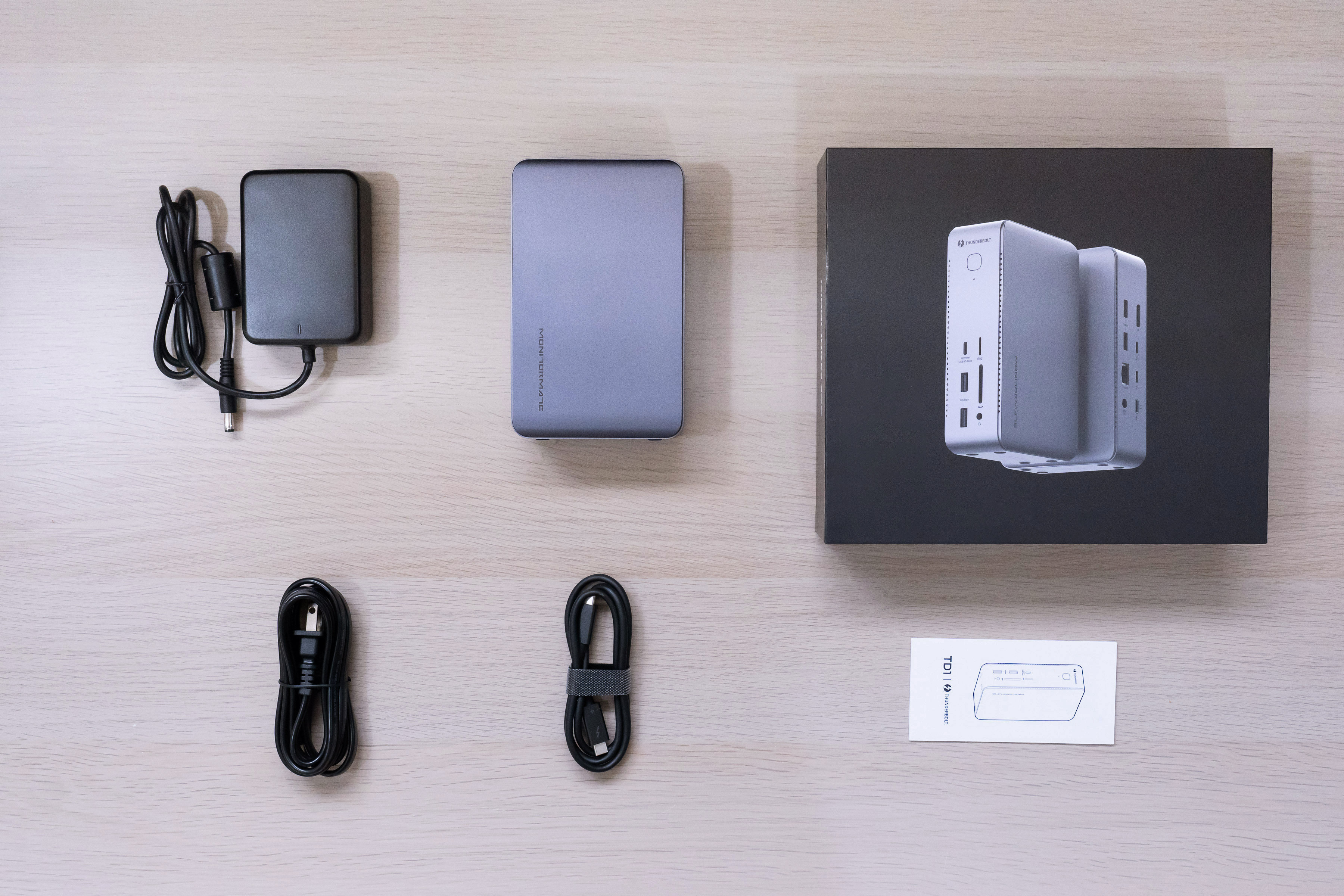 ▲ TD1 盒裝內容物:TD1 擴充埠、Thunderbolt 線材、GaN 變壓器及使用說明書
