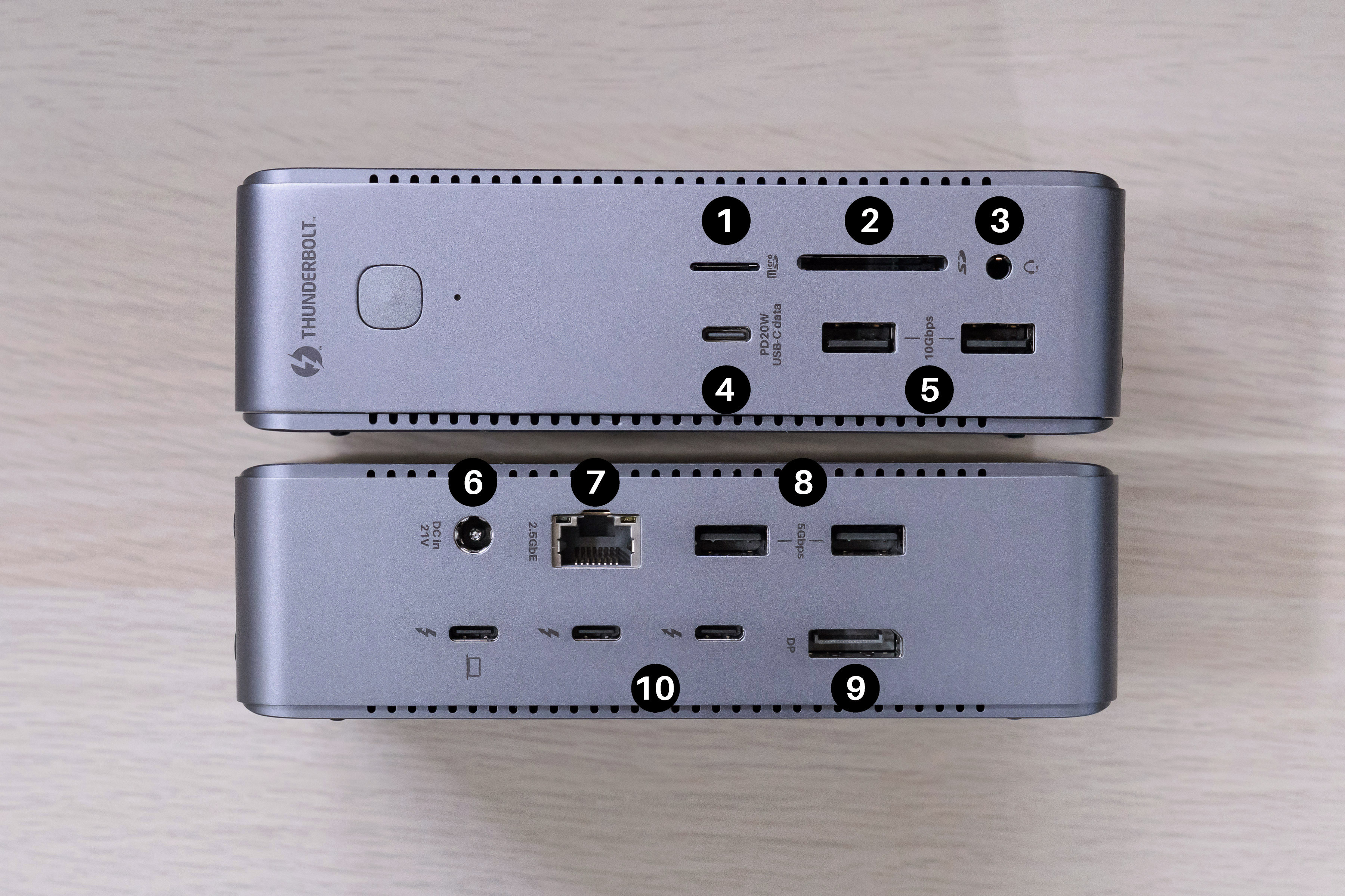 後方則負責較常固定在桌上的介面:分別為 ⑧ 兩個 USB-A、⑨ 一個 DisplayPort 1.4 的 DP 接口、⑩ 2 個 Thunderbolt 4 連接埠、⑥ 160W DC in 跟一個 ⑦ 2.5GbE 的高速網路孔。不論 USB-C 或是 DP 埠都可以輸出 8K@30 超高清畫面(7680 x 4320 解析度,分辨率是 4K 的 4 倍!)
